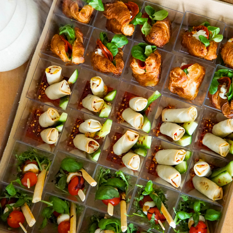 10 szt. monoporcji croissantów z pesto rosso, szynką mozzarellą, roszponką, 10 szt. sajgonek z warzywami i kurczakiem w sosie chilli ze słupkami warzywnymi, 10 szt. monoporcji sałatki caprese na rukoli z grissini