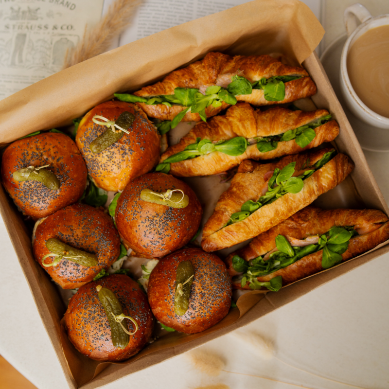 6 szt. mini burgerów z szarpaną wieprzowiną, karmelizowaną cebulą, roszponką, serem, sosem majonezowo-musztardowym, 4 szt. croissantów z pastą z kaparów i oliwek, szynką dojrzewająca, mozarella, rukolą, posypką z suszonych pomidorów