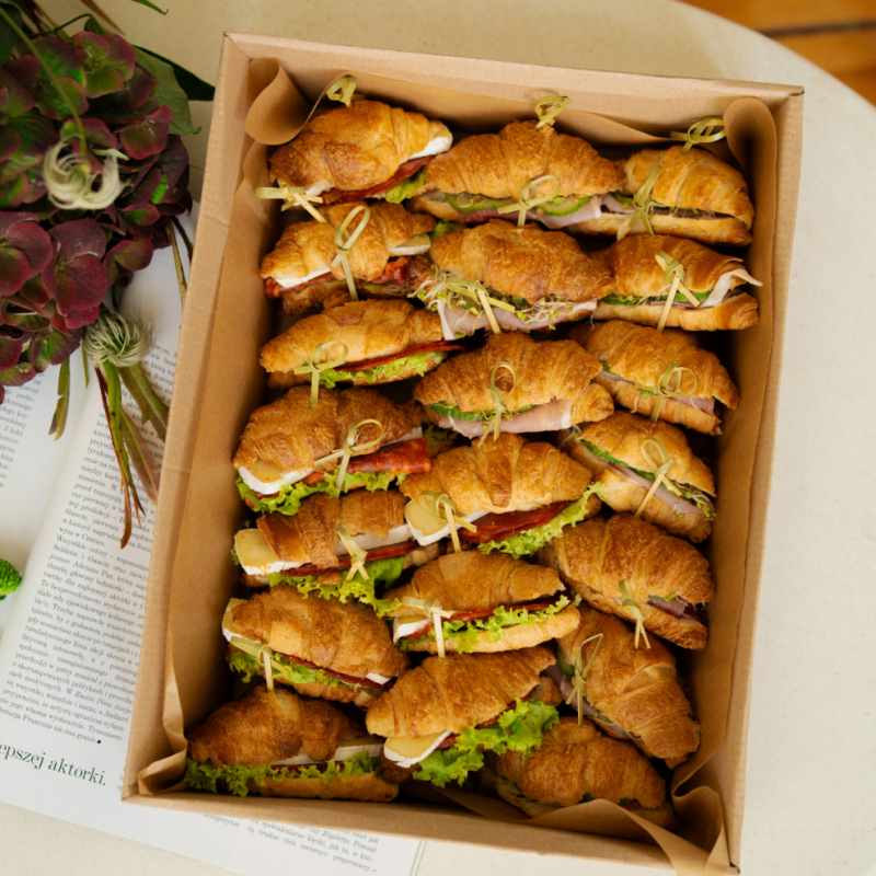 W skład mini croissants box mięsny wchodzi*: 10 szt. mini croissantów z serkiem śmietankowym, szynką prosciutto, ogórkiem świeżym i kiełkami: 10 szt. mini croissantów z pesto rosso, chorizo, camebertem i sałatą.