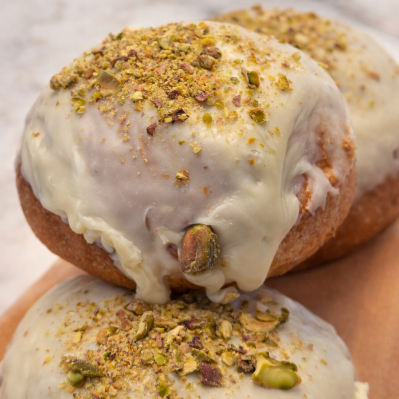 Lekki, puszysty pączek pieczony, wypełniony aksamitnym kremem pistacjowym i przełamany świeżą nutą malin. Idealne połączenie delikatnej słodyczy, orzechowej głębi i owocowej świeżości. Mniej ciężki niż tradycyjny, a równie kuszący — perfekcyjny wybór dla tych, którzy kochają słodkości w nowoczesnym wydaniu.