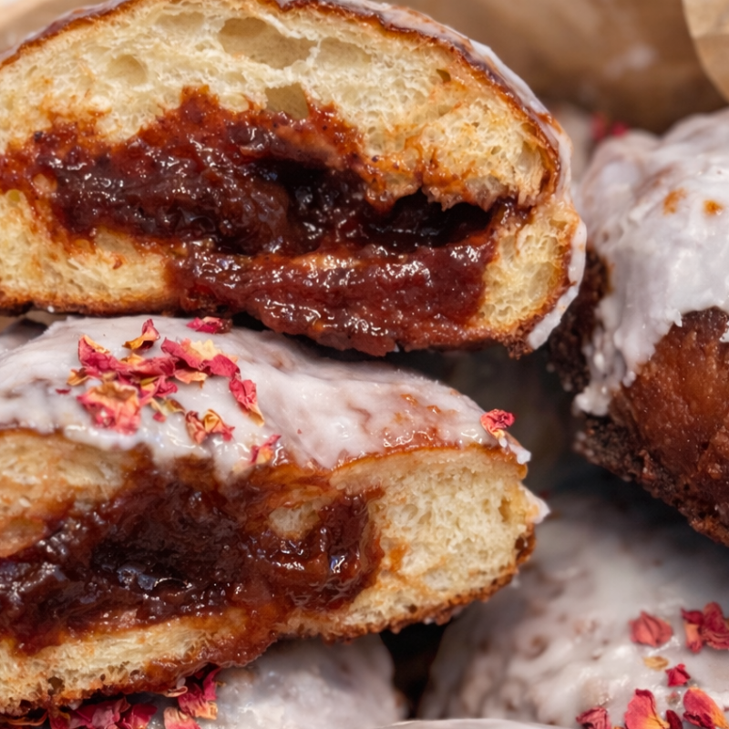 Smażony pączek z naturalnymi powidłami śliwkowymi i lukrem