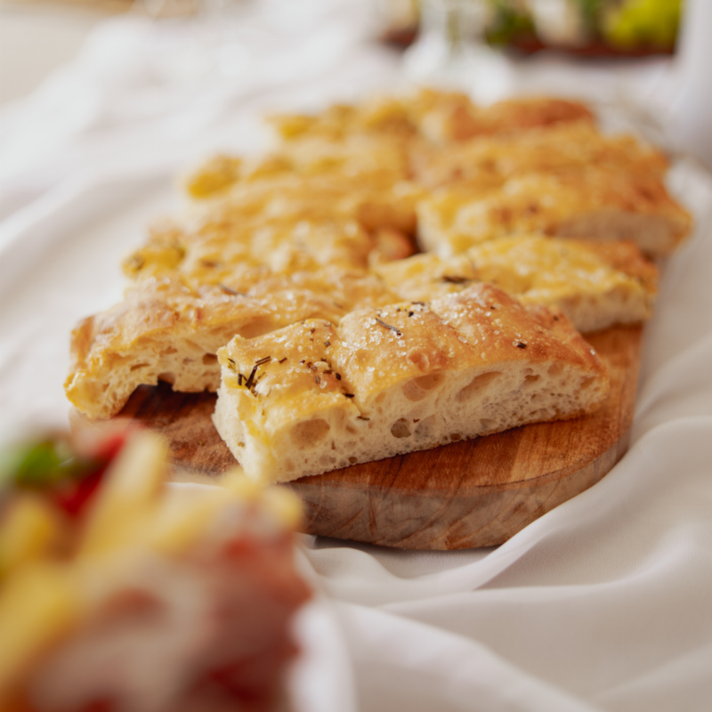 Włoski klasyk w naszej odsłonie – puszysta, długo wyrastająca focaccia o złocistej, lekko chrupiącej skórce. Wypiekana z dobrej oliwy z oliwek, aromatycznego świeżego rozmarynu i szczypty gruboziarnistej soli, która podkreśla jej smak.