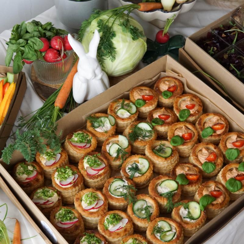 Zestaw eleganckich, francuskich tartaletek idealnych na wielkanocny stół. Kruche, maślane spody wypełnione są aromatycznymi pastami i świeżymi dodatkami, tworząc lekkie i efektowne przekąski typu finger food.