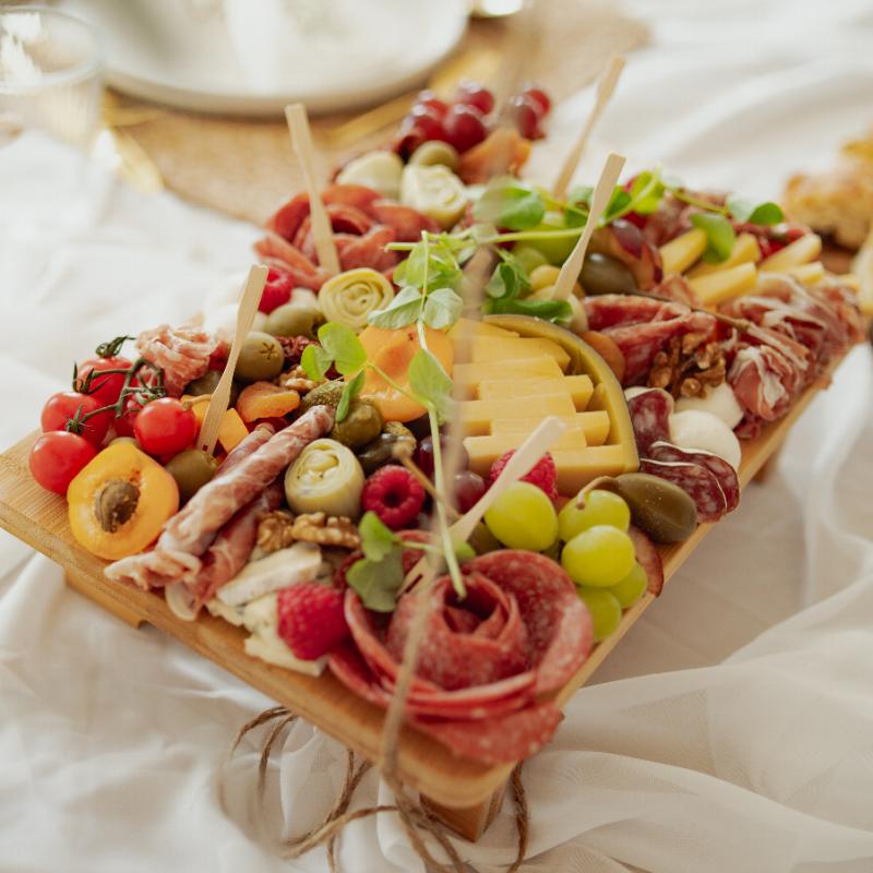3 rodzaje wędlin np. salami, kabanosiki, szynka dojrzewająca, min. 3 rodzaje serów np. camembert, mimolet, ser mierzwiony, bursztyn, cheddar, ser pleśniowy, oliwki, papryczki marynowane, korniszonki, winogrona, sezonowe owoce, orzechy, chrupkie przekąski