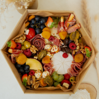 3 rodzaje wędlin np. salami, kabanosiki, szynka dojrzewająca, min. 3 rodzaje serów np. camembert, mimolet, ser mierzwiony, bursztyn, cheddar, ser pleśniowy, oliwki, papryczki marynowane, korniszonki, winogrona, sezonowe owoce, orzechy, chrupkie przekąski