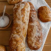 Pszenny chlebek we włoskim stylu na drożdżowym zaczynie. Nocne wyrastanie dodaje mu charakteru i wyrazu, a dodatek oliwy z oliwek podkręca delikatnie słony smak. Idealny do moczenia w oliwie i przeróżnych masłach smakowych