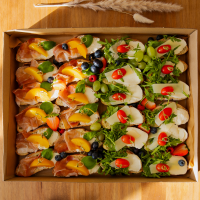 8 szt. mini burgerów, 14 szt. mini croissantów z pesto rosso DOSTĘPNA WERSJA VEGE, 12 szt. szaszłyków z gruszką, camembertem i rukolą, 12 szt. szaszłyków z sałatą, serem gouda, pomidorkiem, boczkiem i korniszonem, sezonowe owoce