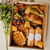 2 szt. gofrów belgijskich w karmelizowanym cukrze, 2 szt. mini bowl z sezonowymi owocami, 2 szt. croissanty w wybranym smaku, 2 szt. smoothie sezonowego
