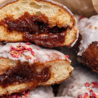 Smażony pączek z naturalnymi powidłami śliwkowymi i lukrem
