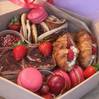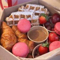 6 szt. mini croissantów maślanych, 2 szt. mini bowl świeżych sezonowych owoców, 2 szt. słodkich gofrów, 4 szt. słodkich makaroników, sos słony karmel, nutella